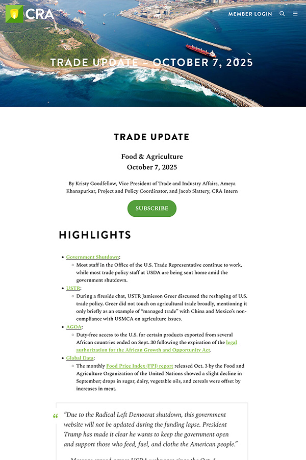 CRA’s weekly Trade Update newsletter is a premier, single source of information to help you quickly and efficiently track developments and see how trade, food and agriculture issues interconnect. Each week you’ll have access to trade news carefully curated by CRA’s seasoned trade experts specifically for the food and ag community.