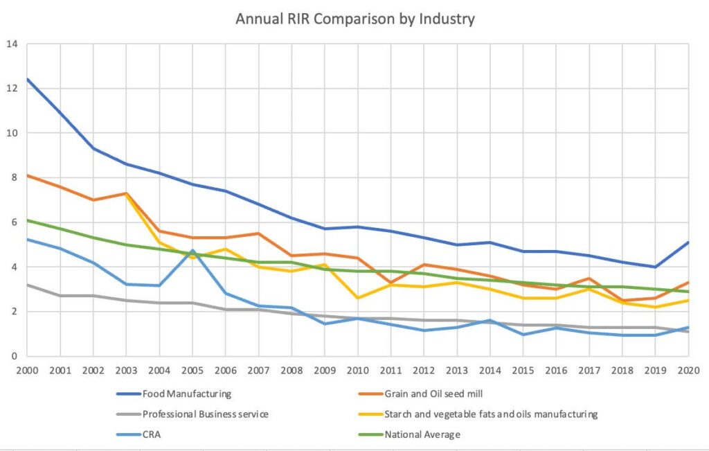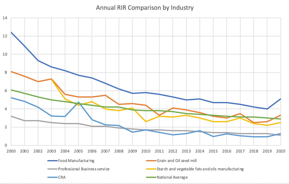 He found that, in the early 2000s, corn refining had a recordable incident rate (RIR) hovering near 6.0. This rate is common in relatively dangerous industries like aluminum smelting and auto manufacturing. Since then, the industry’s injury rate has declined to nearly 1.0. An RIR of 1.0 is common in occupations considered safe, such as office work. CRA celebrates members’ commitment to safety every year through our Safety Awards Program.
