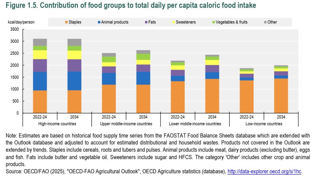 - The Outlook projects that global per capita calorie intake of livestock and fish products will increase by 6% over the next decade, driven by rapid rise in lower-middle-income countries, where growth is anticipated to reach 24%.