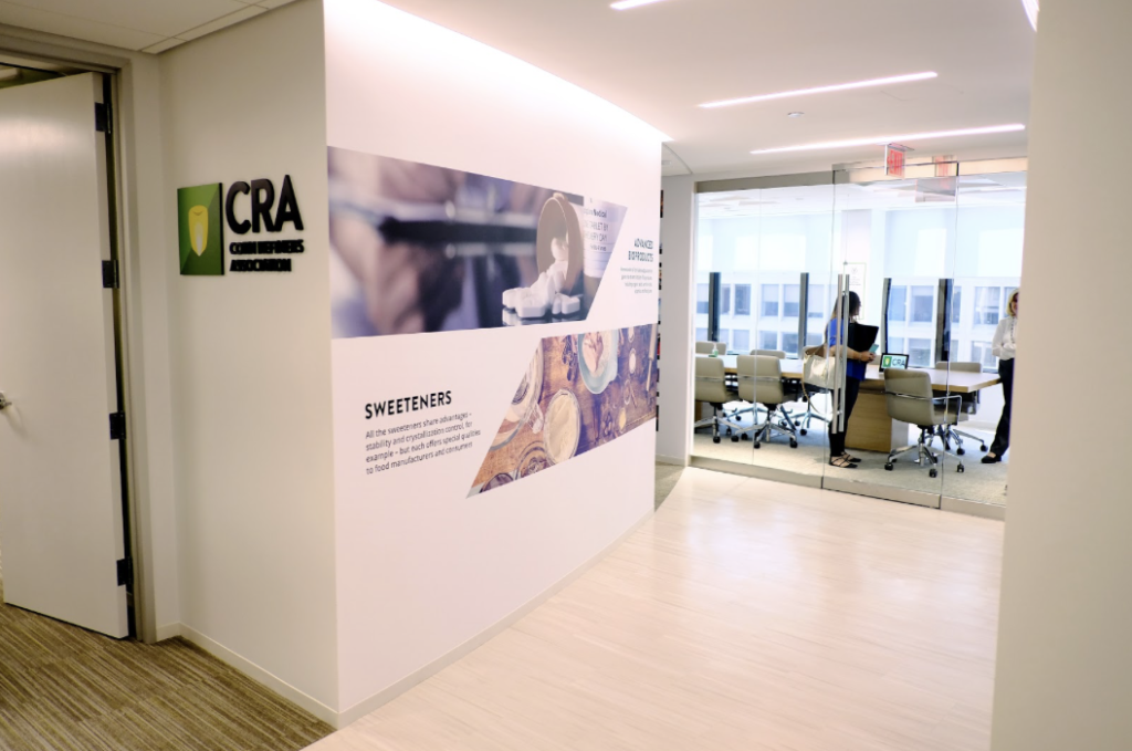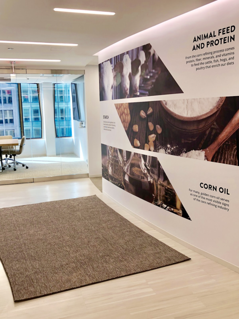 Cornstarch is found in a broad range of adhesives, including wallpaper glue and on the back of envelopes and stamps. A corn product called dextrin is a key ingredient in creating those tacky, water-activated surfaces, and was used in our offices to hang our graphic walls.
